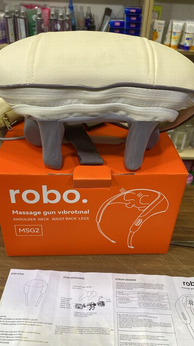Gri renkte, elastik askılı ve halter boyun tasarımlı masaj aleti. Omuz, boyun, bel, sırt ve bacaklara yönelik, lastik malzemeden yapılmıştır.