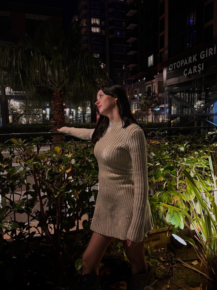 Yüksek yakalı, uzun kollu ve bej tonlarında triko kumaştan yapılmış, vücuda oturan midi uzunlukta elbise. Sokak stiline ve romantik akşamlara uygun.