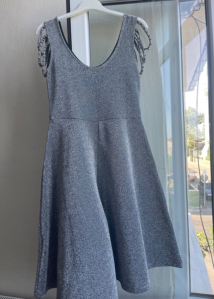 Pırıltılı kumaş kol detaylı elbise s/m bedenlere uygundur 1 kez giyildi temiz elbise
