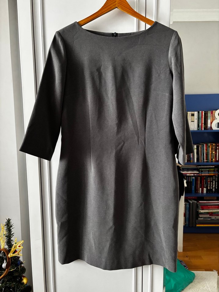Gri midi uzunlukta, kısa kollu, dokusu ve yuvarlak yaka detayıyla ofis kullanımı için uygundur. Sadece bir kez giyilmiştir kalın tok kumaştan gri renkli fakir kol kol detayındaki düğmeler çok şık bir görüntü vermiştir