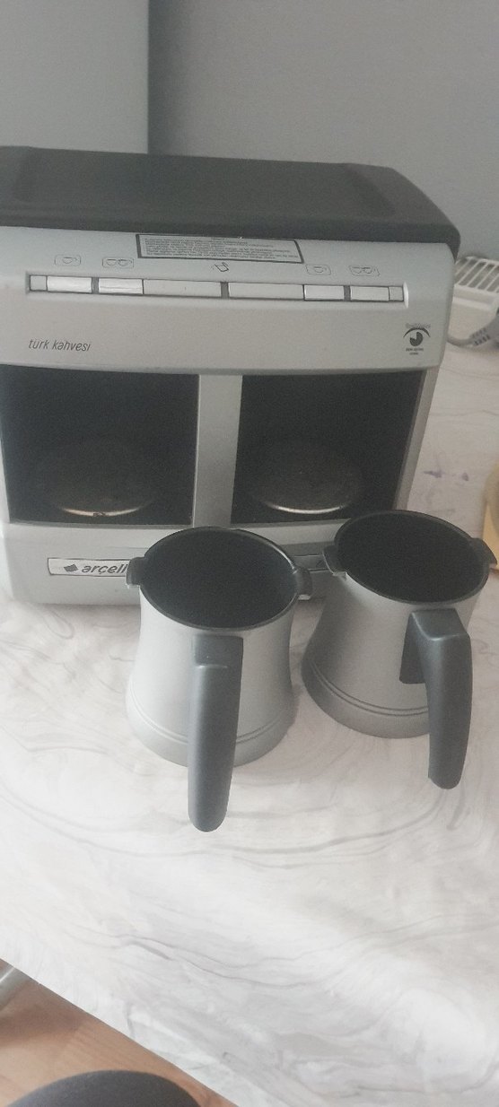 Gri renkte, üzerinde kontrol düğmeleri bulunan ve iki kulplu cezve ile Türk kahvesi yapmaya uygun kahve makinesi. ☕