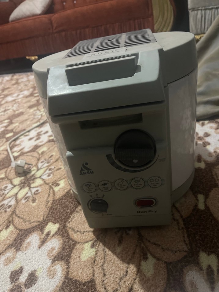 Gri renkli elektrikli fritöz ve ızgara, ayarlanabilir sıcaklık kontrolü ve çeşitli pişirme seçeneklerine sahiptir. Kompakt ve kullanımı kolaydır. Bı defa tek kullanıldı üç suzgecı asansörlüdür