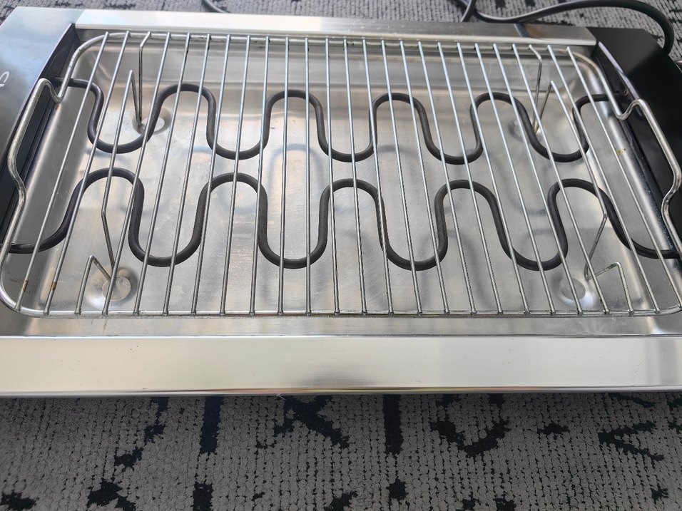 Metal ızgarası ve altında ısıtıcı elemanı bulunan gri elektrikli ızgara. İç mekan kullanımı için uygundur. Bir iki kere kullanıldı sağlam çalışır durumda aynı şekil duruyor.