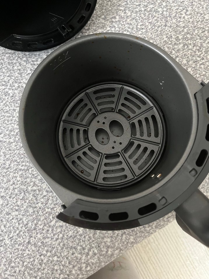 Gri renkli elektrikli ızgara ve fritöz, eşit pişirme için havalandırma delikli çıkarılabilir sepet içerir.
