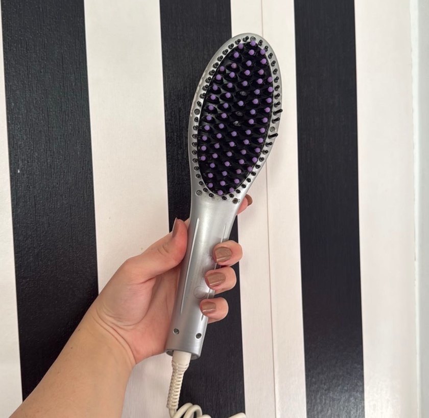 Gri renkte elektrikli saç düzleştirici fırça, rahat tutuş ve saçları düzleştirmek için tasarlanmış kıllara sahiptir. Kullanımı kolaydır. ✨