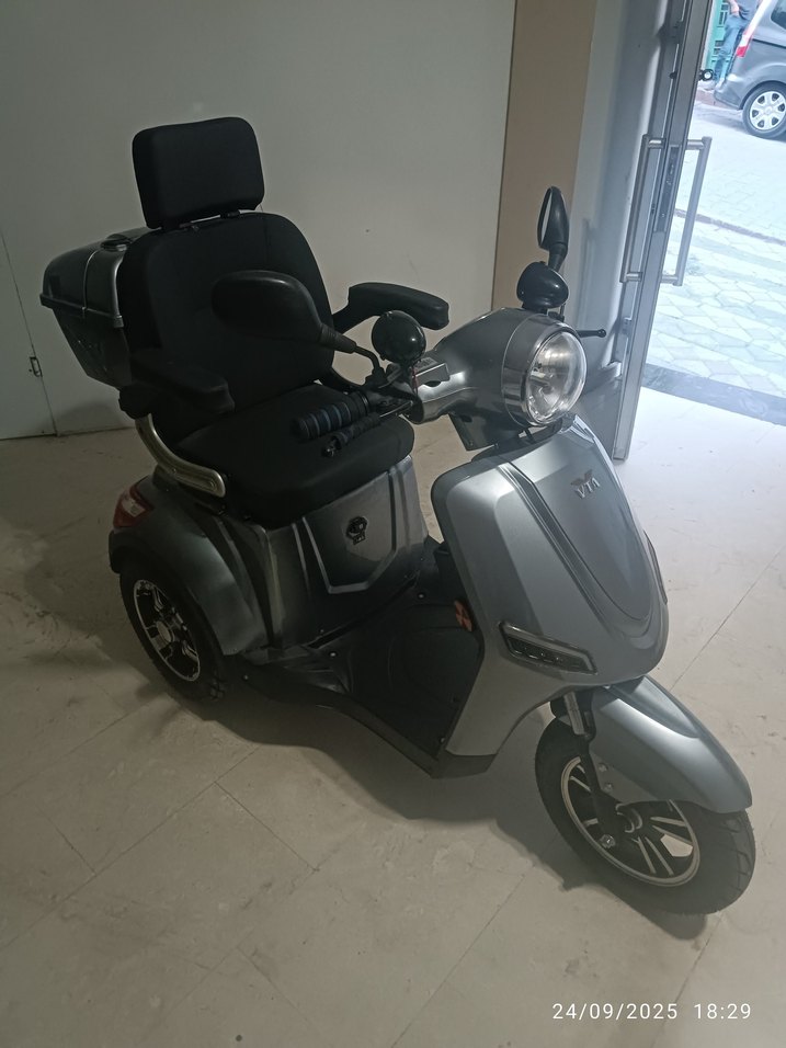 Gri renkte, sırt dayamalı ve kolluklu rahat oturma alanı, büyük far ve sağlam tekerlekleri olan elektrikli scooterı.