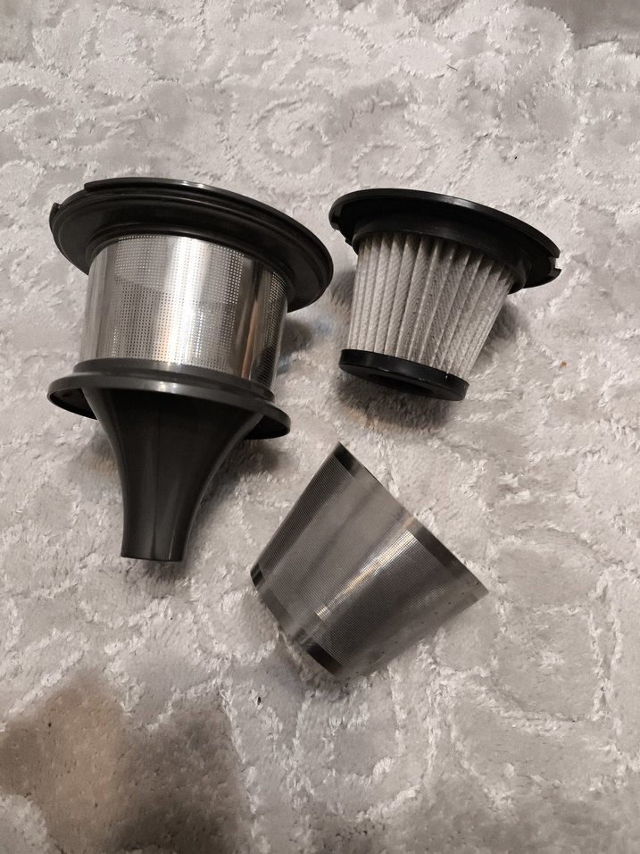 Toz tutma özelliği olan metal ve kumaş filtrelerden oluşan gri elektrikli süpürge filtre seti.