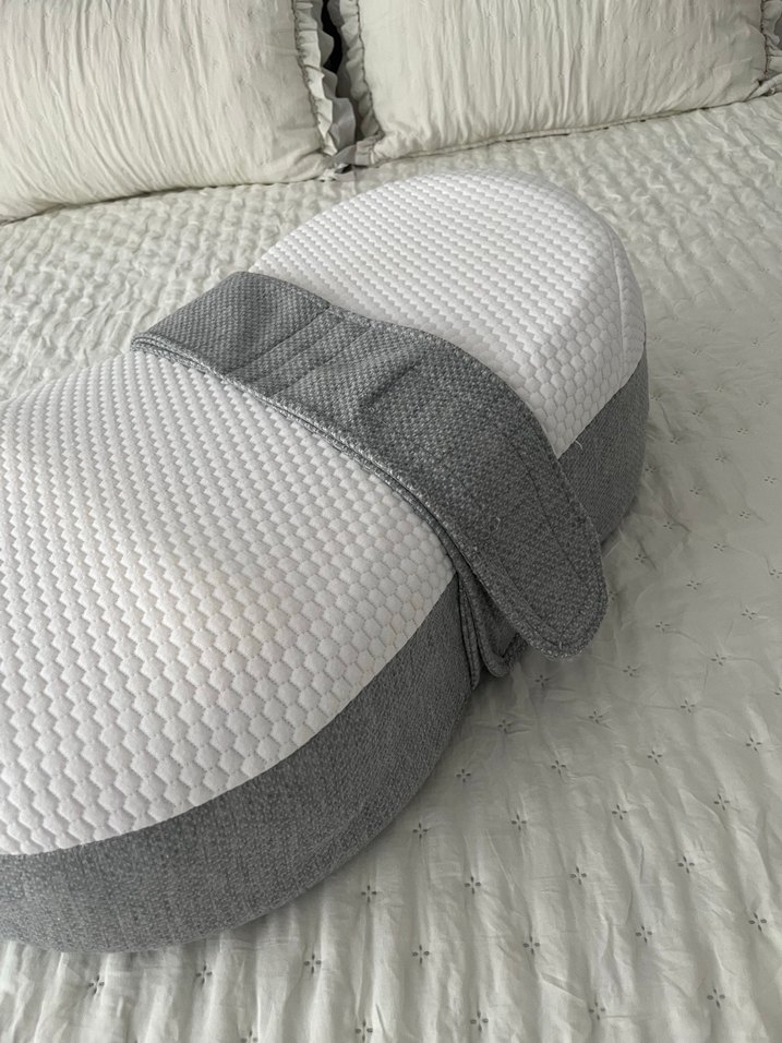 Yumuşak dokulu yüzeyi ve düz kumaş yanları olan gri hamilelik ve emzirme destek yastığı, konforlu destek sağlar.