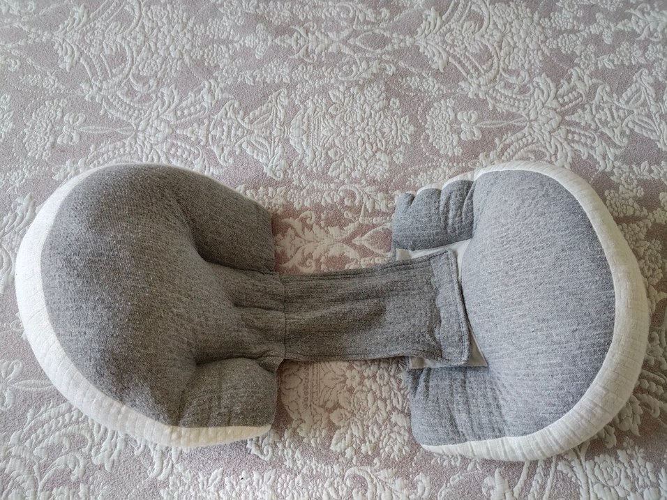Gri renkte, yumuşak kumaştan yapılmış, hamilelik ve emzirme için destek sağlayan şekilli yastık. Desensiz ve rahat kullanımlık.