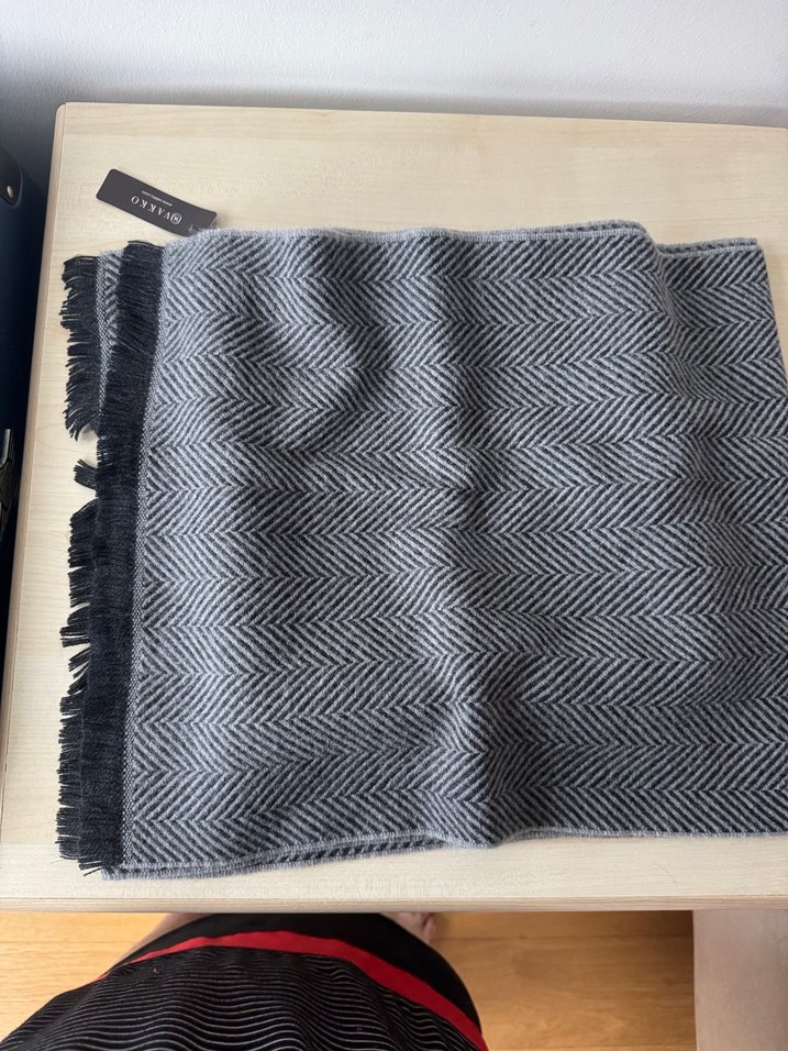 Gri erkek atkı, hafif kılçık desenli ve yumuşak dokulu, rahat ve modern bir stile sahiptir, uçları püsküllüdür.