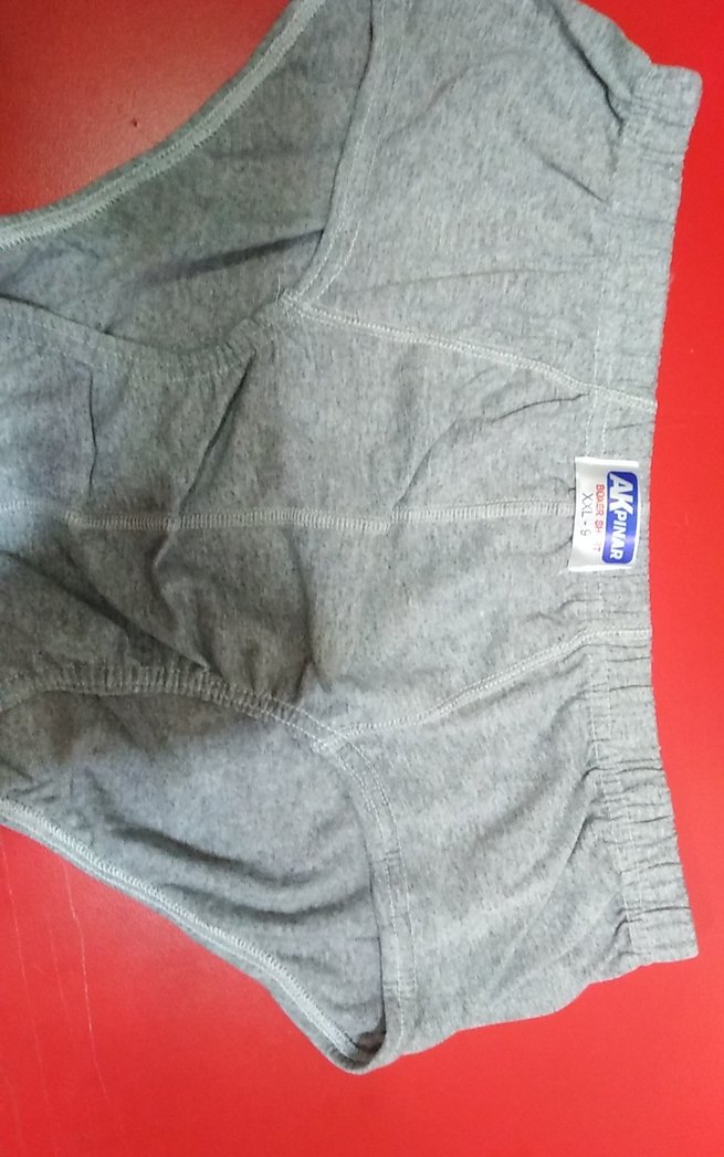 Gri renkli erkek slip külot. Üzerinde Akpınar markası ve XXL beden etiketi bulunur.