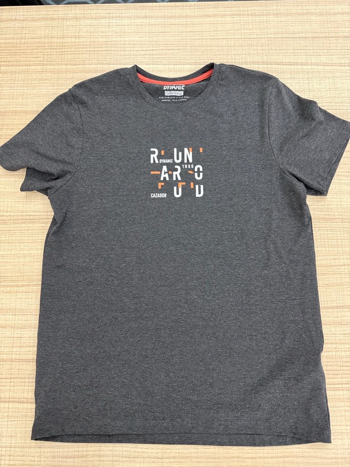 Cazador pamuklu, gri renk, baskılı ve kısa kollu, yuvarlak yaka, rahat kesim tişört. Spor ve gündelik sokak stili için uygundur. Bir kere giyildi. Hiçbir sorunu yoktur.