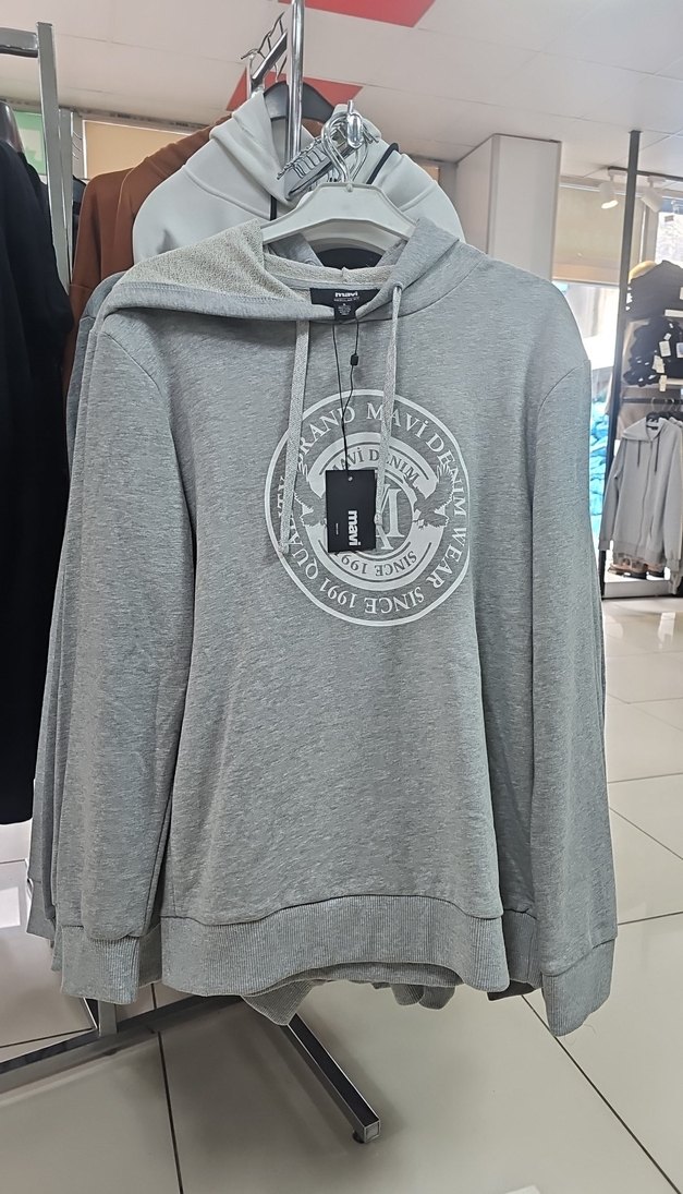 Gri renk, kapüşonlu ve baskılı erkek sweatshirt, uzun kollu ve rahat kesimdir. Yumuşak kumaşı ve normal boyuyla günlük sokak stiline uygundur.