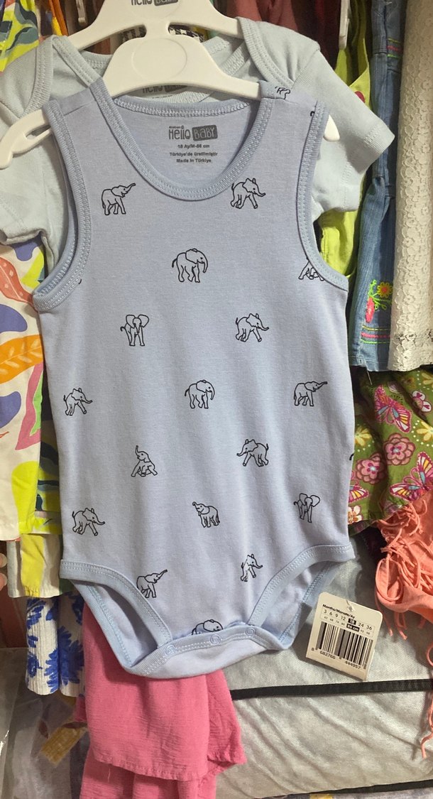 Açık mavi. Gri renkli, askılı ve pamuklu erkek bebek body. Küçük fil desenleriyle süslenmiş, yumuşak ve rahat.