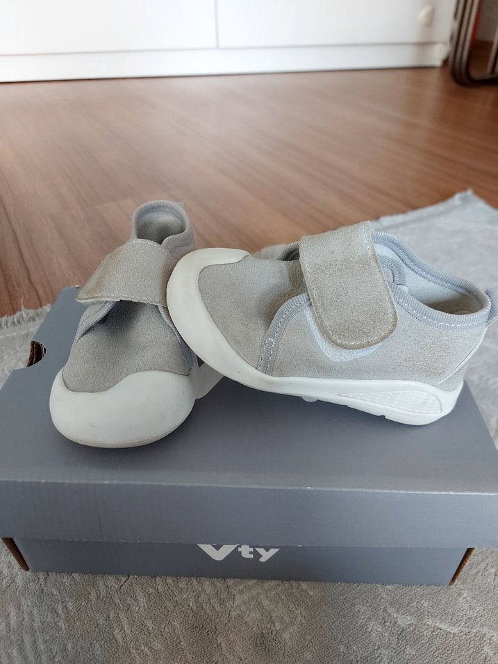 Gri renkli, cırt cırtlı ve kauçuk tabanlı erkek bebek ilk adım ayakkabısı, günlük sokak stiline uygun.