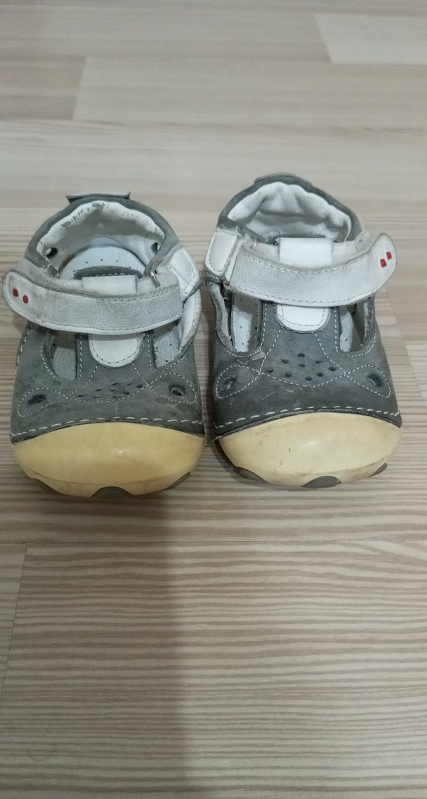 Gri renkli, lastik tabanlı, tokalı erkek bebek ilk adım ayakkabısı, rahat günlük kullanım için uygundur.
