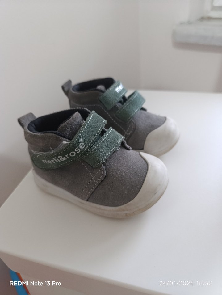 Gri renkli, kaymaz kauçuk tabanlı, Velcro bantlı erkek bebek ilk adım ayakkabısı, baskılı ve sokak stilinde tasarlanmıştır.