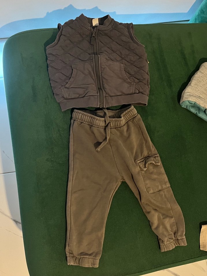 Gri kapitone yelek fermuarlı, kargo cepli pantolon bağcıklı bel ile. Yumuşak ve sıcak kumaş, yuvarlak yaka tasarımına sahip.