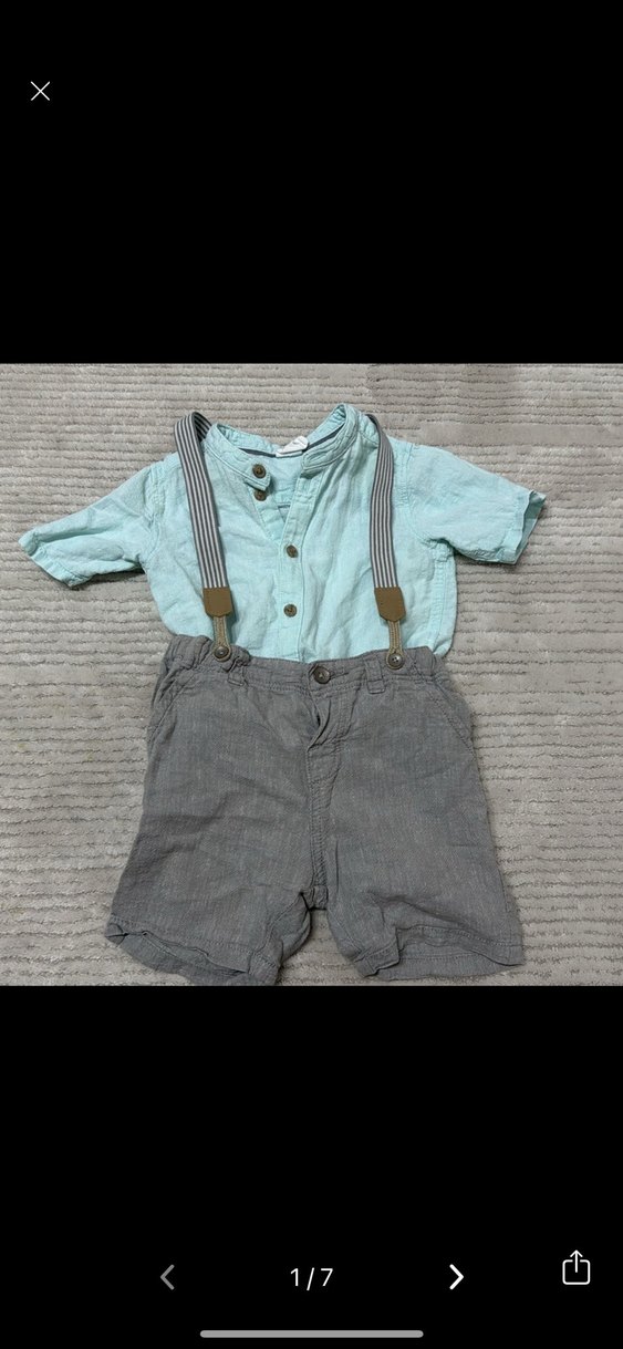 1-2 kez giyildi Keten kumaştan kısa kollu gömlek ve tokalı askılı gri şorttan oluşan erkek bebek takımı. Rahat ve sade tasarım.