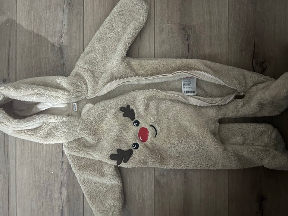 Gri renkli, yumuşak ve sıcak kumaştan yapılmış erkek bebek tulumu, kürk detaylı ve baskılı geyik yüzüyle sokak stiline uygundur. ❄️