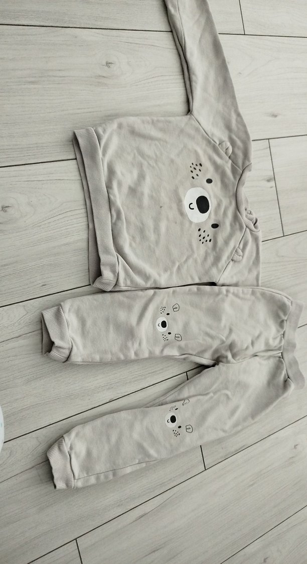 Gri renkli erkek bebek takımı, uzun kollu ve yuvarlak yakalıdır. Nakışlı ayı deseni ve düğmeli detayları bulunur. Yumuşak ve sıcak dokulu kumaştandır.