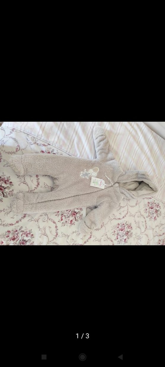 Gri renkli, nakışlı desenlere ve kürk detaylarına sahip, yumuşak ve sıcak kumaştan yapılmış erkek bebek tulumu. ❄️