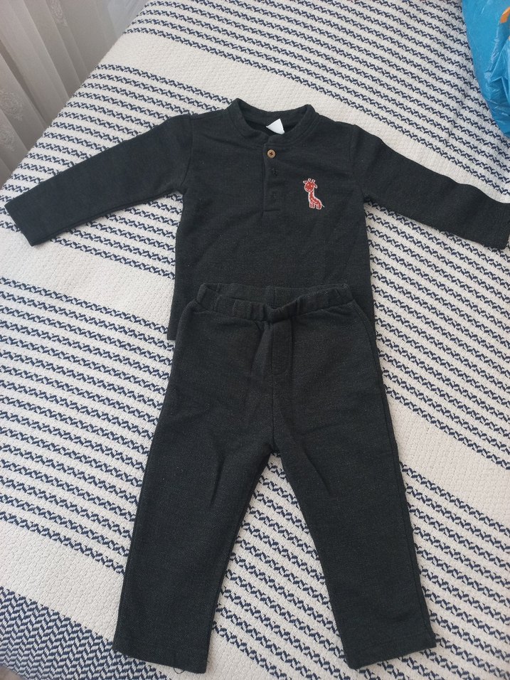 Koyu gri renkte, uzun kollu ve yakası düğmeli bebek takımı. Yumuşak ve sıcak kumaştan, nakışlı detaylı ve lastikli bel pantolonlu.