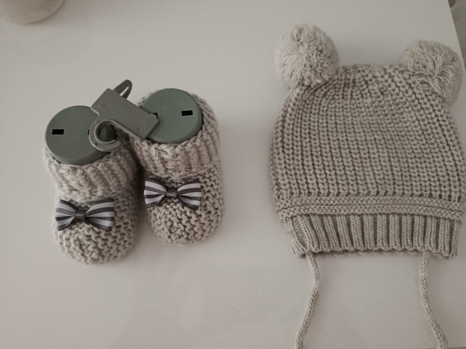 Gri Erkek Bebek Örgü Patik ve Bere Seti