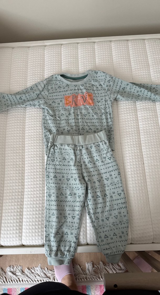 Gri renkli örgü bebek erkek takımı, uzun kollu ve bisiklet yaka. Üzerinde geometrik desenler ve "BRAVE" yazısı bulunur. Rahat sokak stili tasarım. Bir çok kez kullanılmıştır fakat tertemizdir 3-4 yaş uygundur