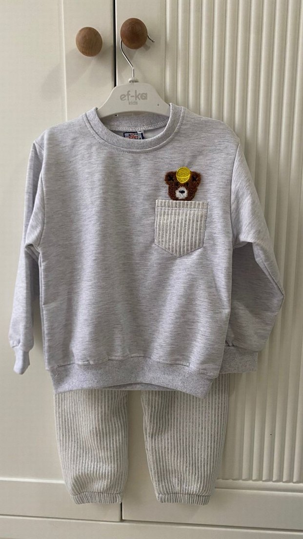 Gri renkli, yuvarlak yaka ve uzun kollu, yumuşak örme kumaştan erkek bebek takımı. Cepte nakışlı ayı detayıyla sokak stili sunar. 2 yaştan başlıyor 5 yaşa kadar