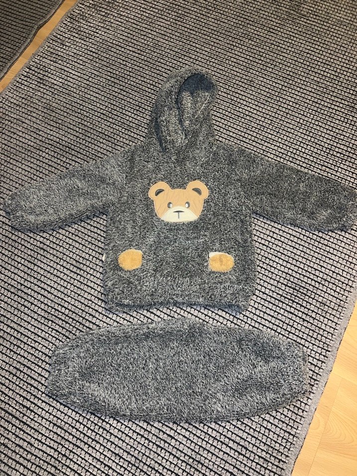 Gri renkli, yumuşak polar kumaştan örme erkek bebek takım önünde nakış ayı deseni ile sıcak ve sokak stili sunar. Tertemiz yumuşacık kalındır