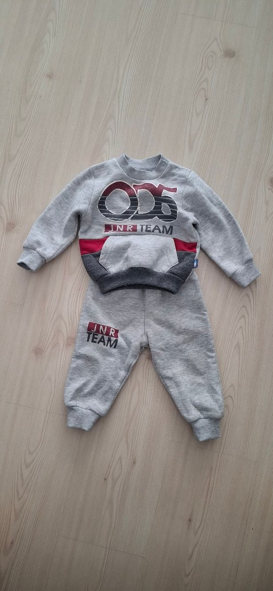 Gri renkli, uzun kollu ve bisiklet yakalı erkek bebek takımı, yumuşak ve sıcak kumaştan üretilmiştir. Baskılı ve örme detaylarla sokak stili sunar.