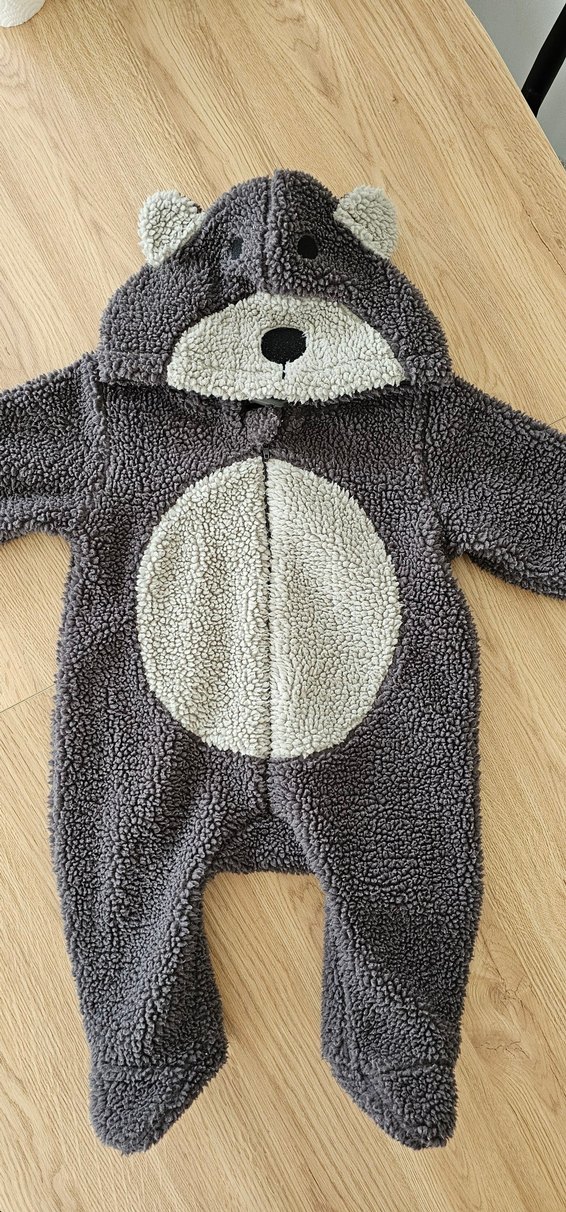Gri renkli erkek bebek tulumu, yumuşak ve sıcak kumaş, kürklü detaylar ve nakışlı desenlere sahiptir. Ayıcık kulaklı kapüşonlu tasarım içerir.