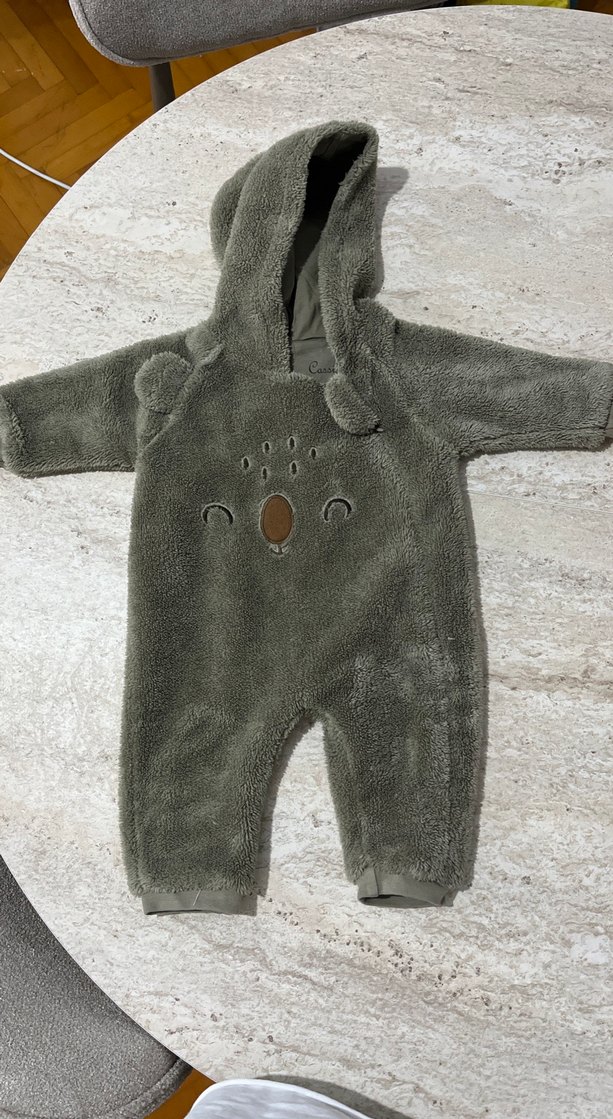 Gri renkli erkek bebek tulumu, yumuşak ve sıcak kumaş, kürk detayları ve nakışlı desenlerle tasarlanmıştır. Kapüşonlu ve rahat bir yapıya sahiptir.