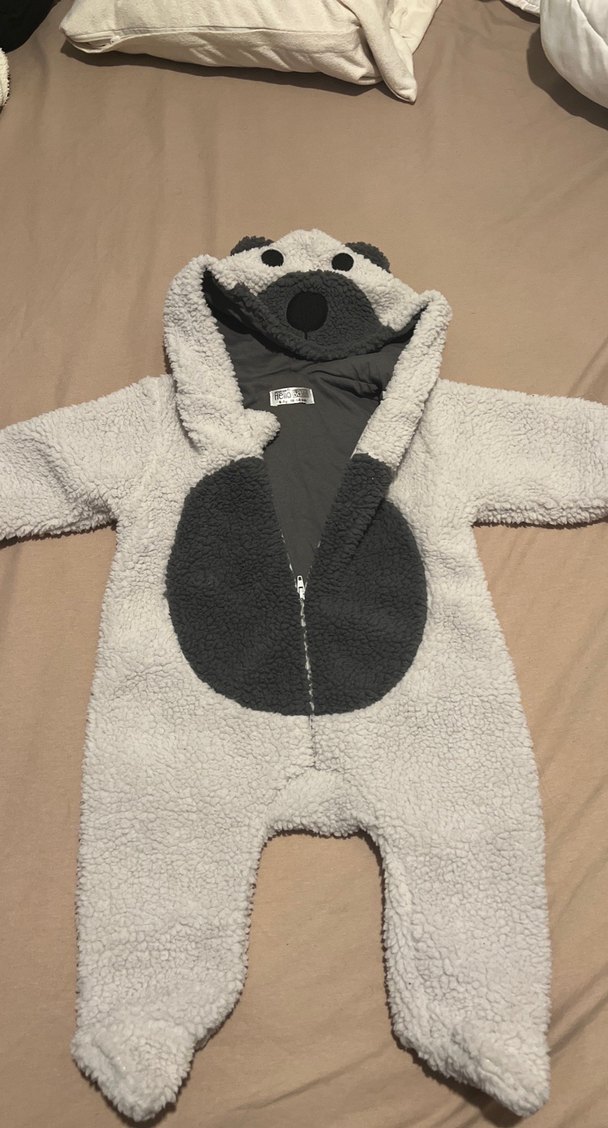 Gri renkli erkek bebek tulumu, yumuşak ve sıcak kumaş ile kapüşon ve ön kısımda kürk detaylarına sahiptir.