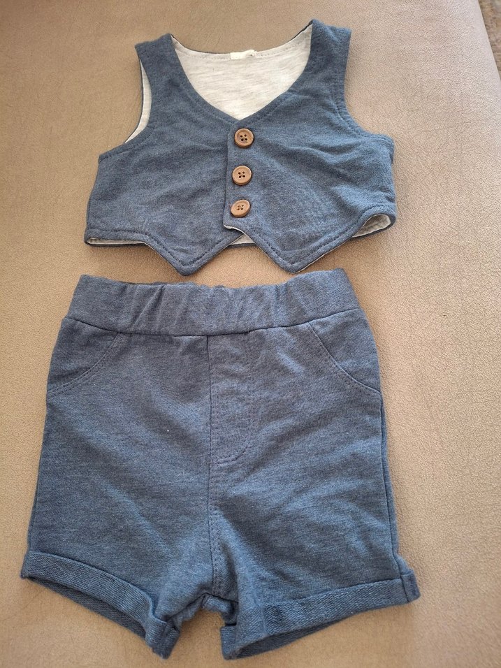 Gri renkli, düğmeli, yakası kesimli yelek ve şorttan oluşan erkek bebek seti, rahat ve sade tasarımlı.