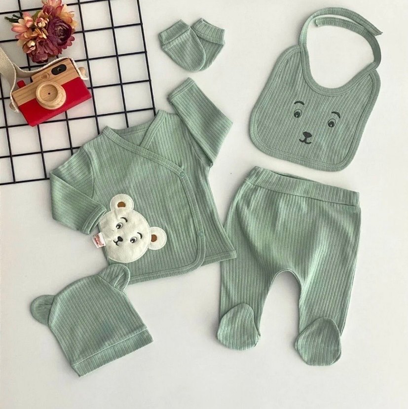 Gri triko kumaştan, uzun kollu üst, ayaklı pantolon, şapka, eldiven ve nakışlı ayıcıklı önlükten oluşan bebek hastane çıkışı seti.