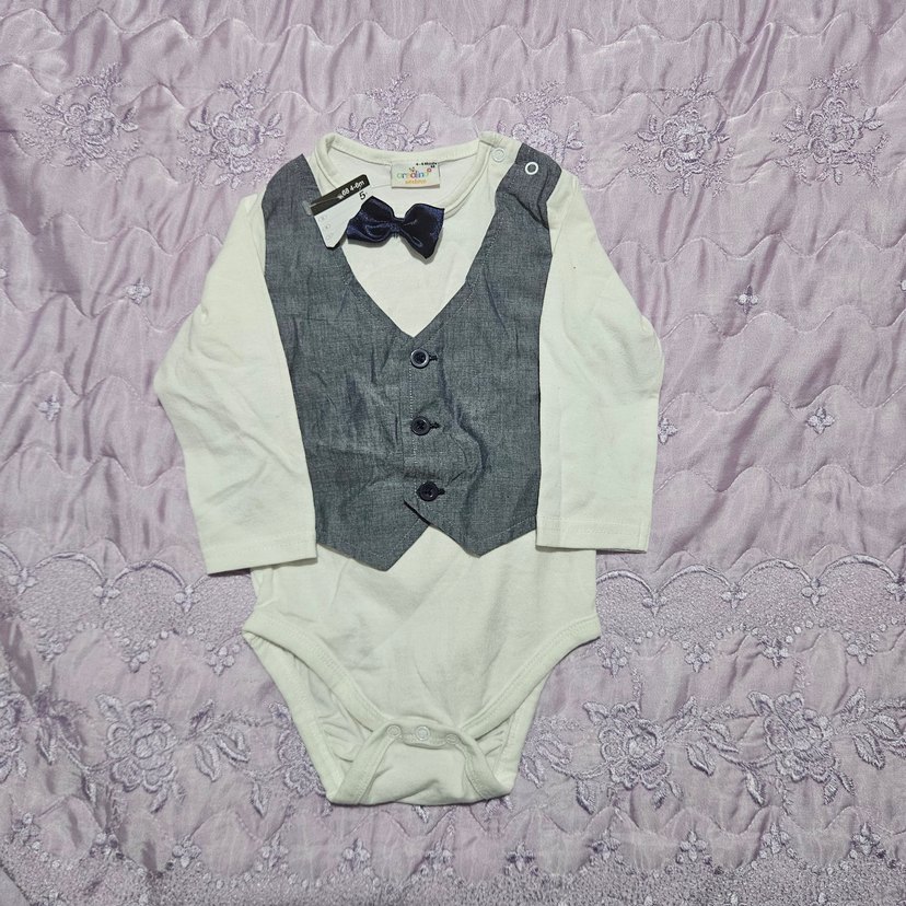 Pamuklu, gri yelek ve papyon detaylı, uzun kollu bebek tulumu. Sokak stili görünümü sunar. 4-6 ay