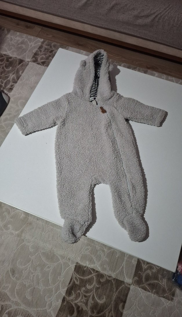 Yumuşak ve sıcak kumaştan yapılmış, kapüşonlu ve ayaklı gri erkek kız benım kızım gıydı bebek tulumu.