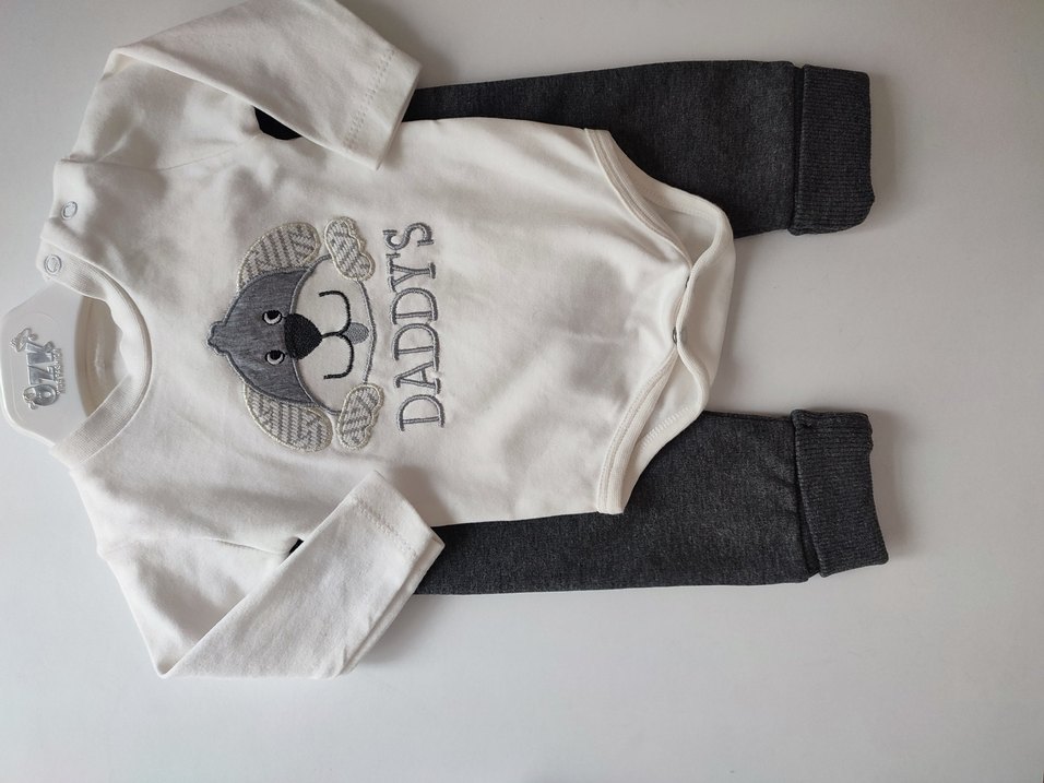 Gri renkte, uzun kollu ve yuvarlak yakalı bebek bodysuit. Üzerinde köpek baskısı ve 'DADDY'S' yazısı bulunur. Düğmeli ve yumuşak, sıcak kumaştan yapılmıştır.