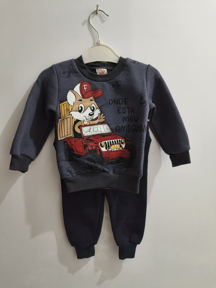Gri renkli, uzun kollu ve yuvarlak yakalı örme kumaştan bebek erkek takım. Araba ve karakter baskılı, şehir stili için uygun rahat tasarım. Alt kısmı lastiklidir. sıfır ürün hiç kullanılmadı