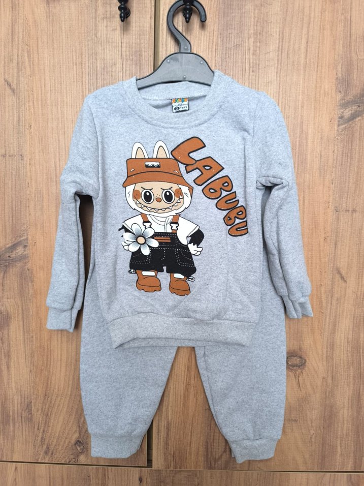 Yumuşak ve sıcak kumaştan, uzun kollu gri sweatshirt ve pantolondan oluşan erkek bebek takımı. Sweatshirtte bisiklet yaka ve baskılı, örgü detaylı çizgi karakter bulunur.