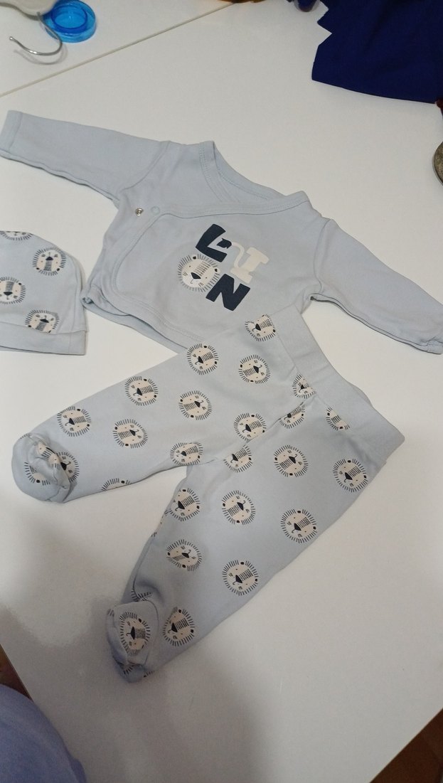 Gri renkli, düğmeli uzun kollu üst, baskılı pantolon ve şapka içeren yumuşak ve sıcak bebek takımı. Yuvarlak yakalıdır.