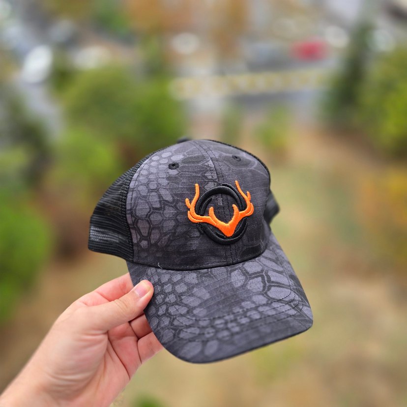Koyu gri dokulu erkek biker şapka, turuncu detaylı amblem ve nefes alabilen file arka kısım içerir.