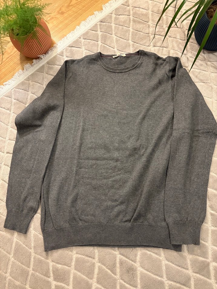 Gri renkte, bisiklet yaka ve uzun kollu, rahat kesim erkek triko. Yumuşak keten kumaştan, sade ve desensiz tasarımıyla günlük sokak stiline uygun.