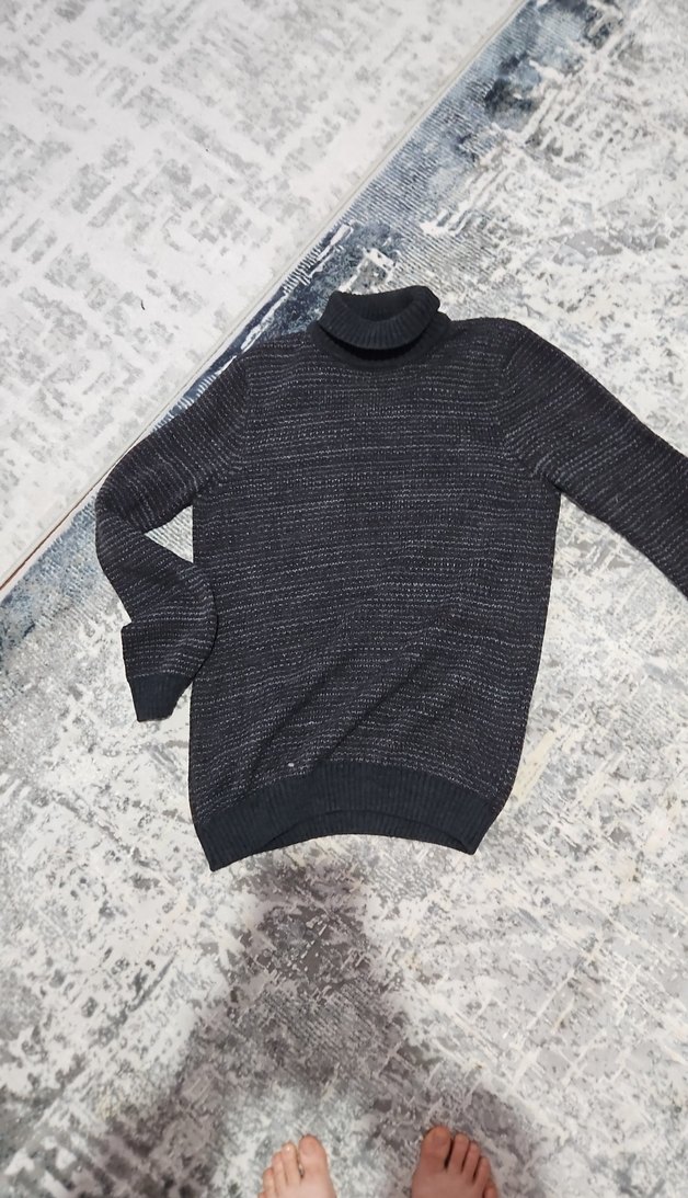 Gri renkte, örgü yün kumaştan, boğazlı ve uzun kollu, erkek kazak. Normal boyda, günlük rahat kullanıma uygun.