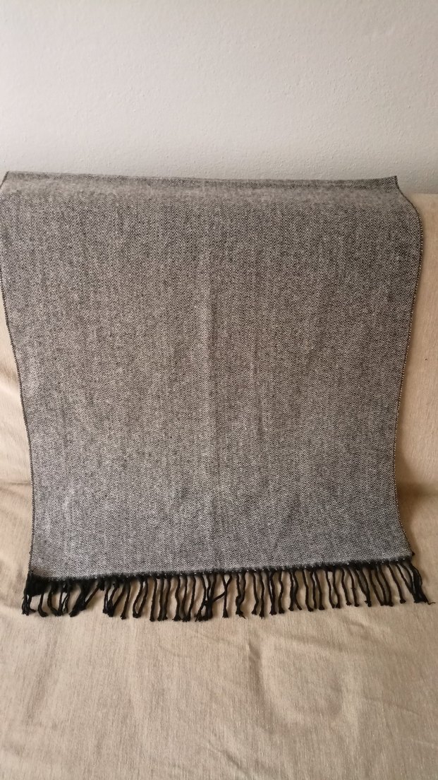 Gri renkte, bohem tarzda, midi uzunlukta ve siyah püsküllü erkek atkısı. Rahat ve sade bir görünüme sahiptir.