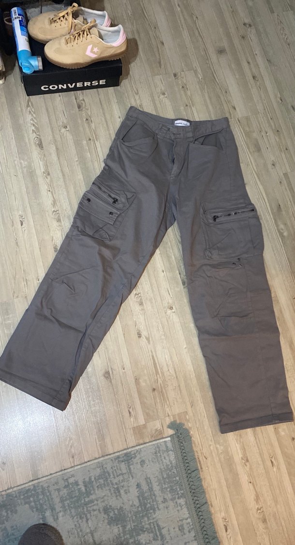 Gri bol kesim ve kemerli, çok cepli rahat kargo pantolon. Outdoor kullanım için uygundur.