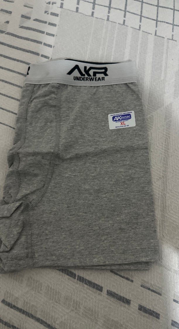 AKR Underwear markalı, normal midi uzunlukta, gri renkli ve vücuda oturan erkek boxer, beyaz logo bantlıdır.