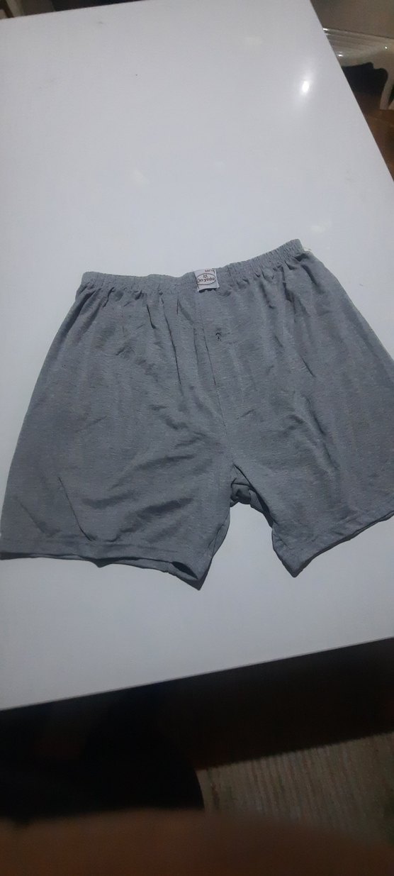Gri renkte, desensiz, normal midi boyunda, bol kesim erkek boxer şort, minimalist tarzda.
